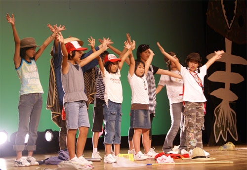 ○平成20年8月南さつま市の「南薩少年自然の家」で1泊2日の合宿を行いました。下の写真は練習の合間の一コマです。みんなの視線が一つに集まって、興味深そうです。なにを見ているのかなあ?